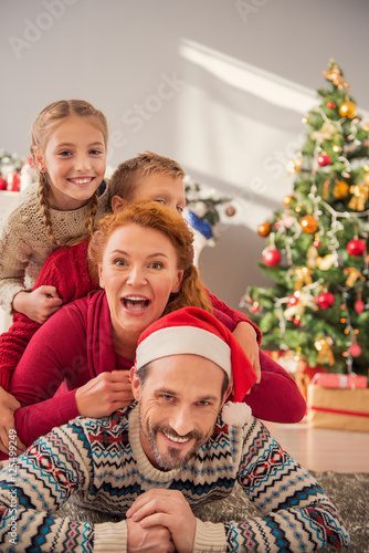 Joyful parents and children celebrating holiday