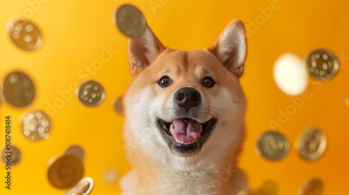 Joyful shiba inu surrounded by falling gold coins on vibrant background