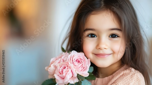 Joyful young girl holding pink roses indoor setting portrait photography soft lighting