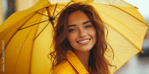 Joyful young woman smiling under a yellow umbrella in a vibrant city street portrait photography cheerful atmosphere natural light