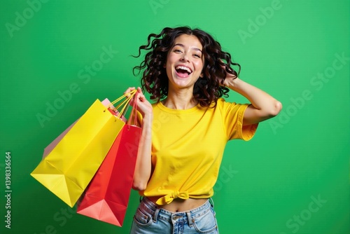 Joyful young woman with shopping bags in stylish summer outfit – vibrant portrait