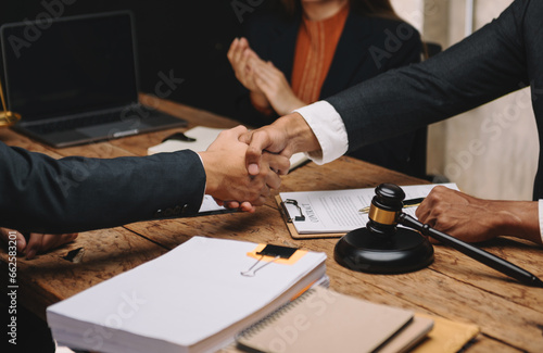 Judge and client shaking hands and lawyers discussing contract papers after adviced in background at courtroom, lawyer service concept in office.