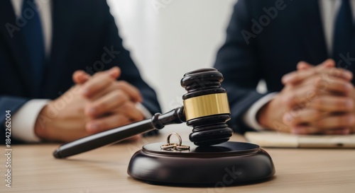 Judge gavel on a table with two blurred businessmen in the background in a courtroom setting for legal or justice concepts
