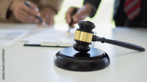 Judge gavel with Justice lawyers having team meeting at law firm background. Concepts of Law and Legal services.