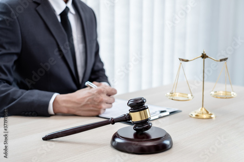 Judges gavel, Professional male lawyers work at a law office There are scales, Scales of justice, judges gavel, and litigation documents. Concepts of law and justice