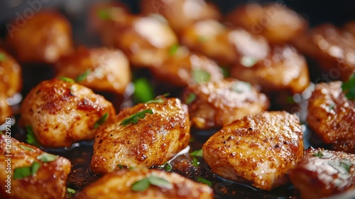 Juicy, golden-brown chicken pieces sizzle in a pan, garnished with fresh herbs, showcasing a delicious, savory meal.