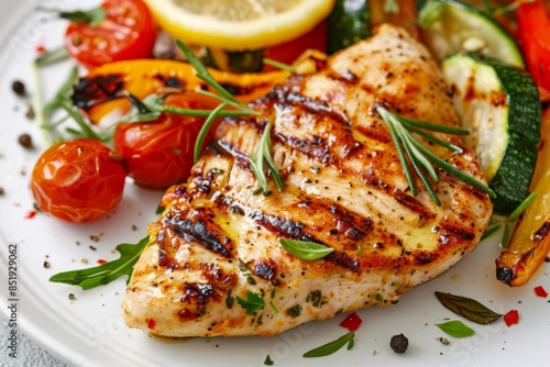 Juicy Grilled Chicken Breast with Perfect Grill Marks and Assorted Grilled Vegetables
