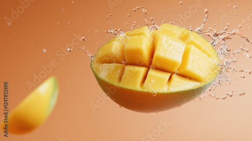 Juicy Mango Slices Splashing, Orange Background, Food Advertising