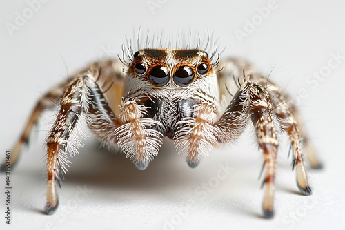 Jumping spider mid leap large forward facing eyes focused tiny fuzzy legs extended brown white fur detailed white background
