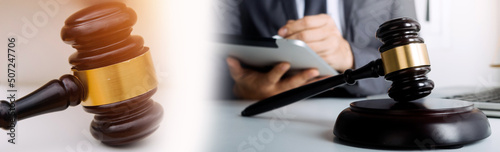justice and law concept.Male judge in a courtroom on wooden table and Counselor or Male lawyer working in office. Legal law, advice and justice concept.