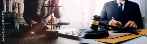 Justice and law concept.Male judge in a courtroom with the gavel, working with, computer and docking keyboard, eyeglasses, on table in morning light