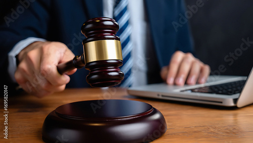 Justice delivered through legal proceedings a judge or lawyer uses a gavel in a courtroom with a laptop nearby signifying modern legal practice.