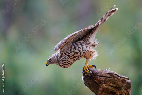 Juvenile northern goshawk ready for take off on a rainy day in the forest- Netherlands