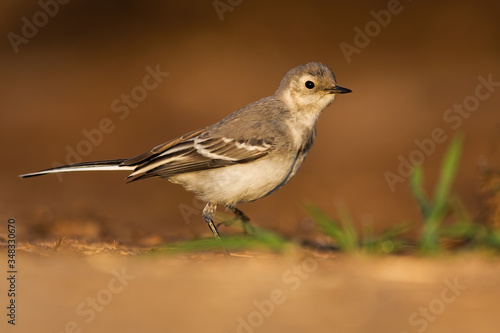 Juvenile white wagtail, motacilla alba, walking on sand of riverbank in summer at sunset. Alert young bird with light and gray feather standing on the ground from side low angle view.