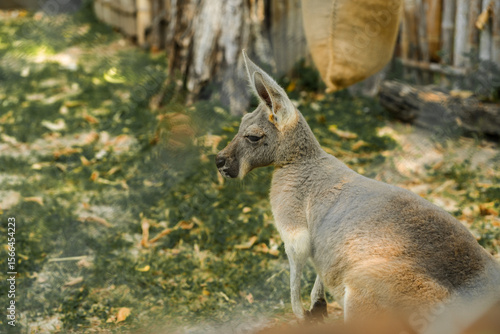 Kangaroo with baby joey in the zoo pouch on grass