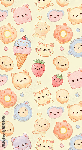 Kawaii Cute Characters Watercolor Pattern Wallpaper Background