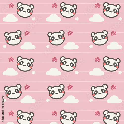 Kawaii Cute Seamless Pattern with Pandas and Clouds on Pink Background