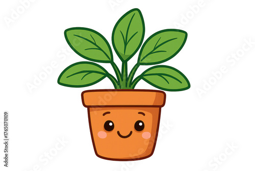 Kawaii houseplant character smiling in a clay pot, cartoon illustration on transparent background