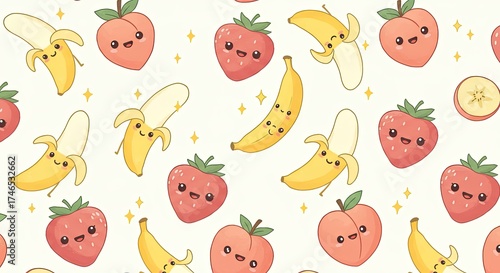 Kawaii Pixel Art Fruit Pattern Featuring Adorable Smiling Strawberries Peaches and Bananas with Sparkles on a Pale Yellow Background Ideal for