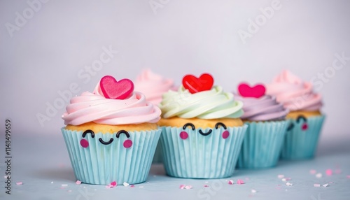 Kawaii-style cupcakes with heart toppings and pastel-colored frosting for Valentine treats.