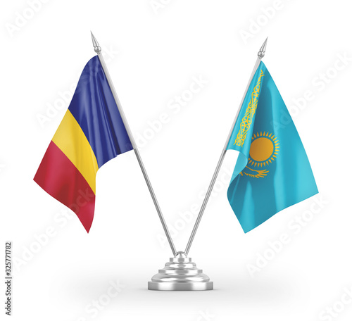 Kazakhstan and Romania table flags isolated on white 3D rendering