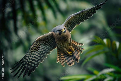 Kestrel bird of prey flying with spread wings in a tropical forest