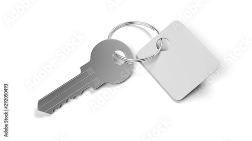 Key isolated on white background. White square blank plastic tag. White empty label keyring. 3d illustration.