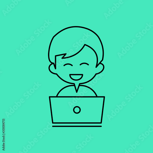 Kid boy using laptop. Outline thin line flat illustration. Isolated.