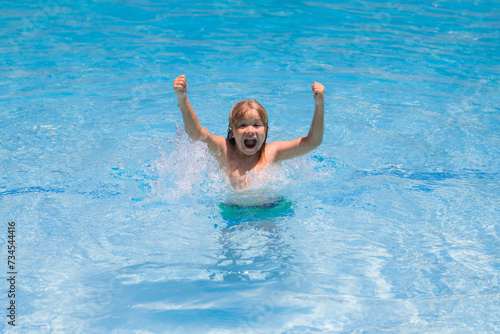 Kid playing in pool. Summer holidays and vacation concept. Happy child playing in the sea or swimming pool water. Summer vacation and healthy lifestyle concept. Cute child splash water at pool.