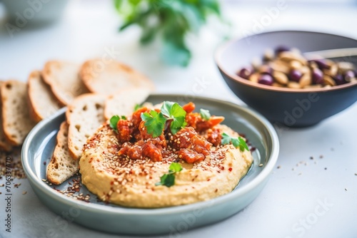 kidney bean hummus with chili flakes and warm bread on side
