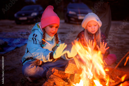 Kids of different ages sit near fire on autumn seashore after sunset, warm their hands, communicate and have a good time together, trust and friendship, active family weekend. Autumn outside lifestyle