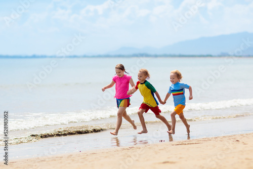 Kids playing on beach. Children play at sea.