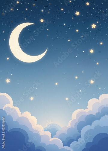kids story book design, night sky with moon, bright stars and clouds