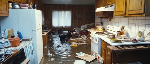 Kitchen engulfed in flood with floating appliances standing water damaged cabinetry peeling paint broken tiles watermarks on walls ominous atmosphere wet countertops scattered debris
