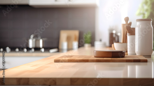 Kitchen surface against blurred kitchen background. Generative Ai