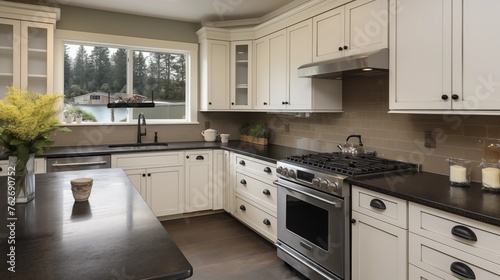 Kitchen with off-white cabinets and leathered charcoal black granite counters.