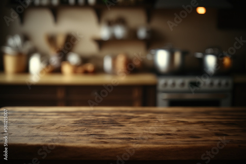Kitchen wooden table top with blur background. Created with Generative AI Technology