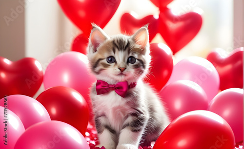 Kitten sitting amidst a sea of pink and red heart-shaped balloons, rose petals scattered around, romantic atmosphere, detailed texture of the cat's fur. Generative AI