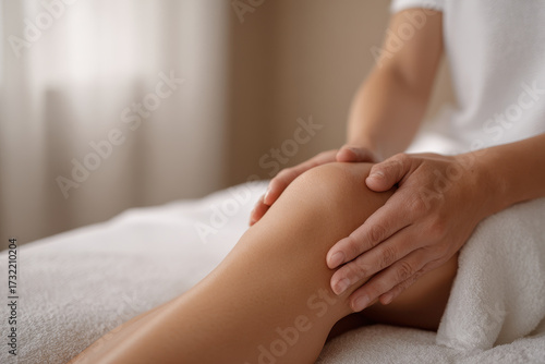 Knee pain, massage, therapy, relief, wellness calm touch on leg during pain care session