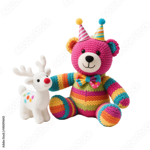 Knitted toy bear with vibrant party accessories and small reindeer plush isolated on transparent background PNG file download.
