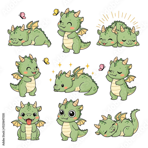Koleksi Lucu Naga Bayi Hijau Kartun dengan Berbagai Ekspresi dan Pose pada Latar Belakang Hitam, Ideal untuk Desain Anak-anak, Ilustrasi Fantasi, dan Materi Pendidikan