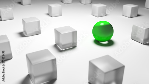 Konzept für Unterschied und Individualität. Eine grüne Kugel steht inmitten einer Gruppe von grauen Würfeln.