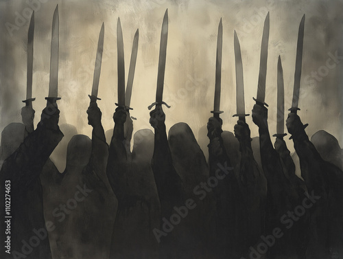 Kriegertum und Macht: Silhouetten mit Schwertern im Sonnenuntergang