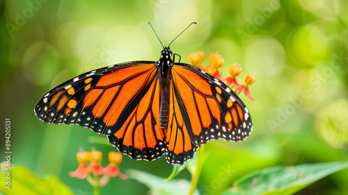 Крупный план бабочки монарх, отдыхающей на ярком цветке, демонстрирующей свои яркие оранжево-черные крылья на мягком зеленом размытом фоне в фотореалистичной сцене природы.