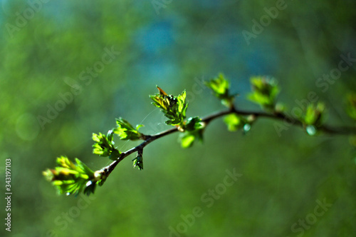 Kwitnąca gałązka drzewa, pąki liści, wiosna.