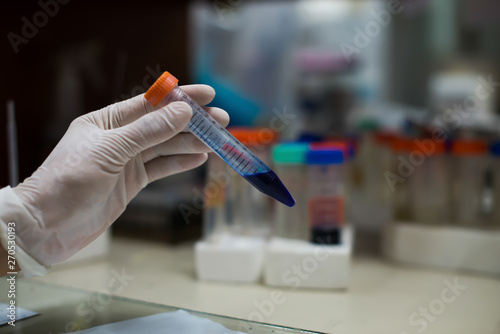 lab technician assistant analyzing a blood sample in test tube at laboratory.