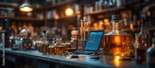 Lab with tablet analyzing amber liquid in bottles and glassware.