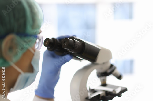 Laboratory assistant in protective suit look through microscope. Laboratory assistant conduct test analysis.