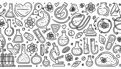 Laboratory doodle icon set. Hand drawn sketch line doodle style scientific education, chemistry laboratory, medicine experiment icon. Microscope, atom, magnet outline element. perfect any project.