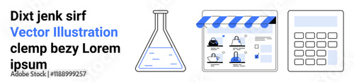 Laboratory flask beside a shopping webpage and a calculator. Ideal for online shopping, e-commerce, education, business analysis, finance, science, marketing. Landing page